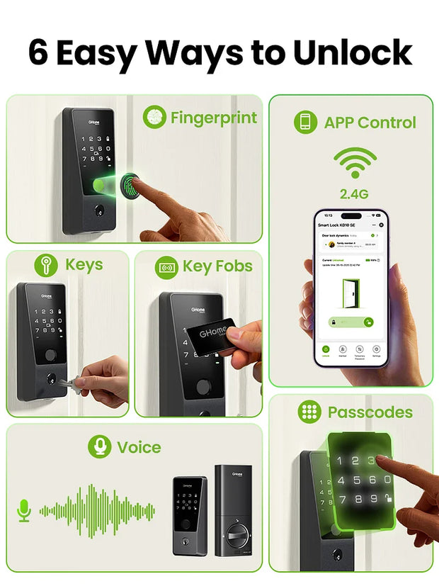 App, Physical key (also known as mechanical key), fingerprint, permanent password, temporary password